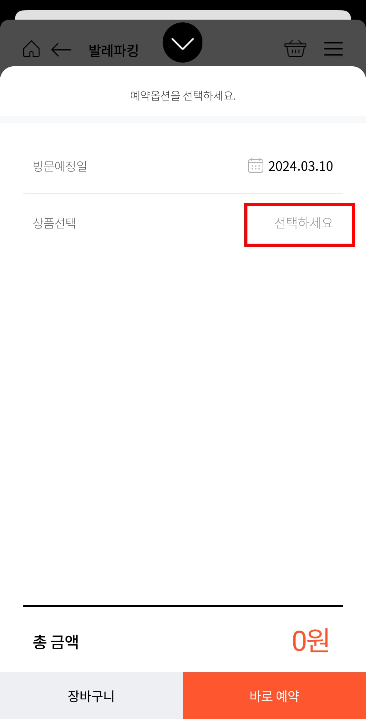 6. 예약 화면이 나오면 "선택하세요" 부분을 클릭 후 하단에 발레파킹 아이템이 생기면 숫자 조절