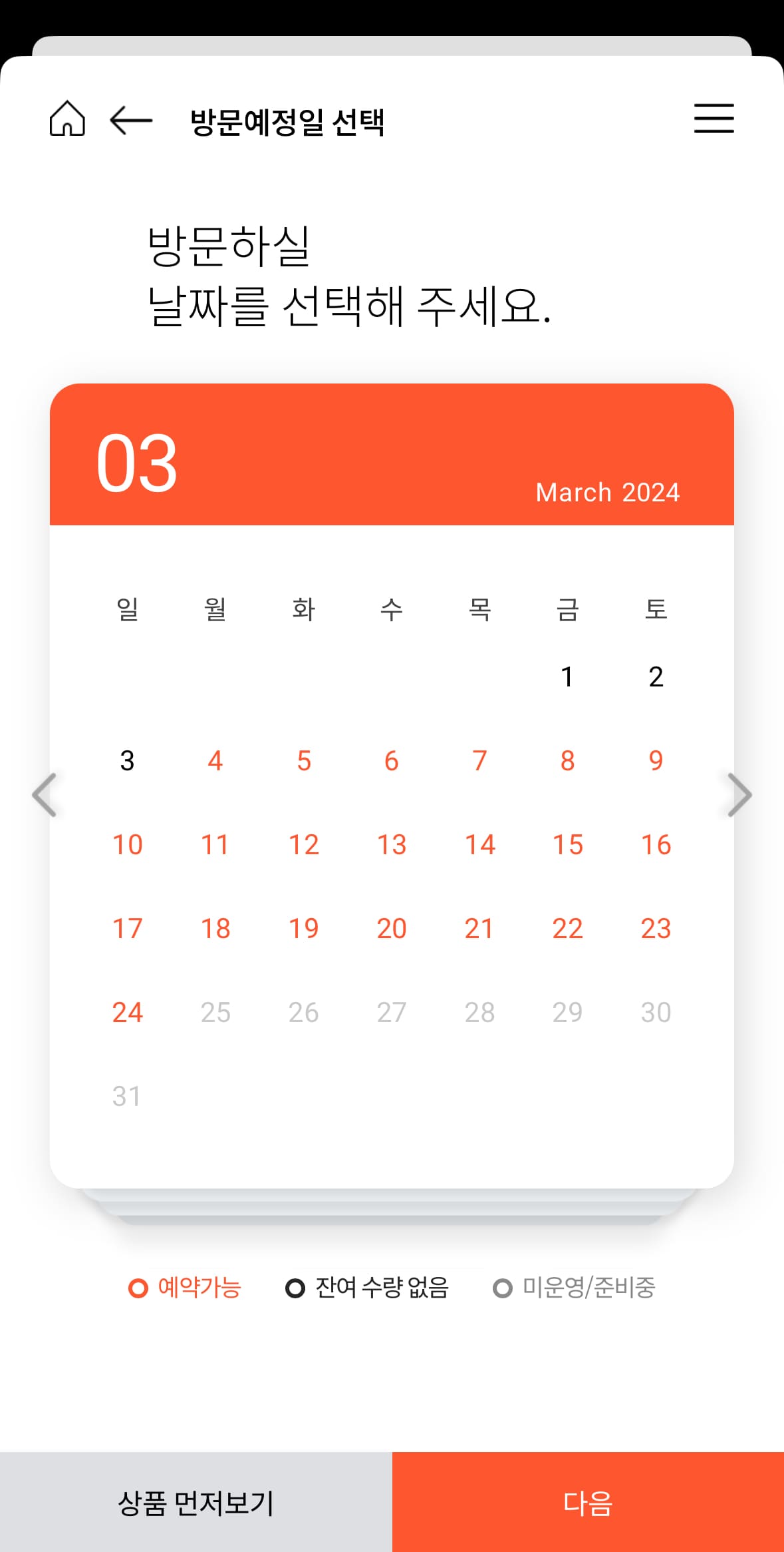 5. 방문 날짜 선택 (캘린더에서 빨간색으로 표시된 날짜만 선택 가능)
