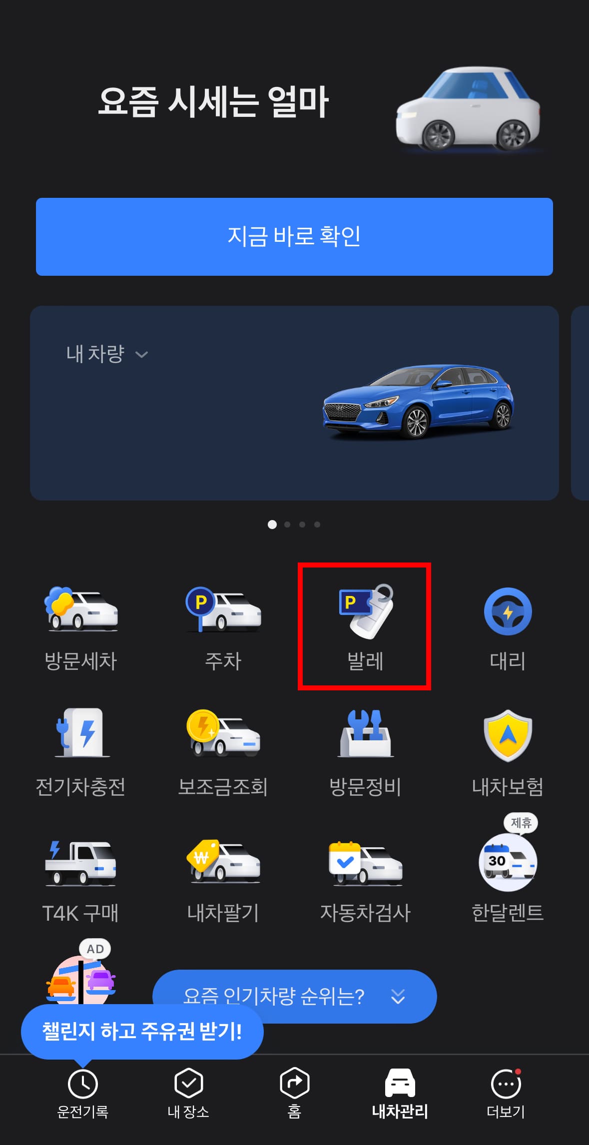 2. 내차 관리 메뉴 중 "발레" 클릭